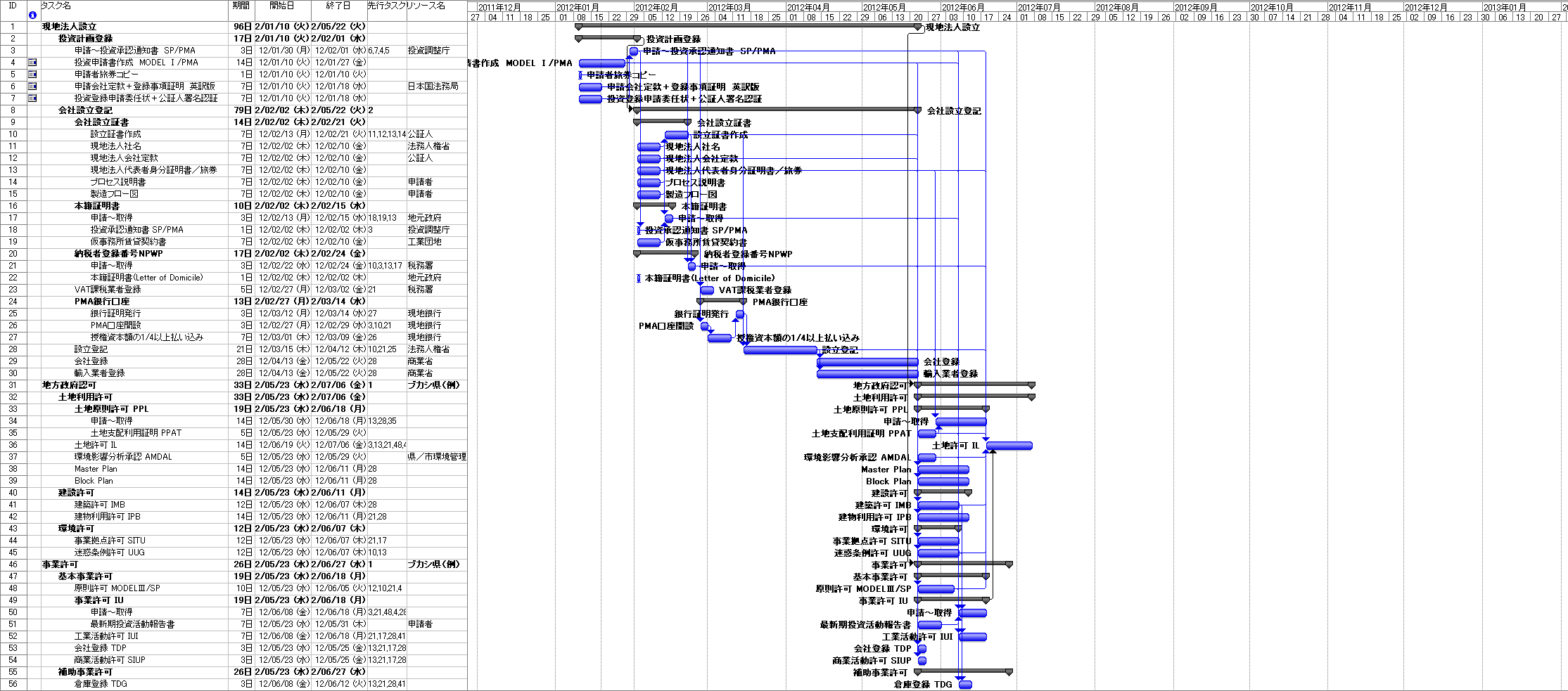 製造業がインドネシアに進出する際の投資申請から生産開始までの約一年間の、170のステップをMS Office Projectで管理するためのデータを作りました。許認可手続は本当に複雑ですが、これで色々とシミュレーションをしなから対処することが出来ます。下記の画面は画面の一部です。