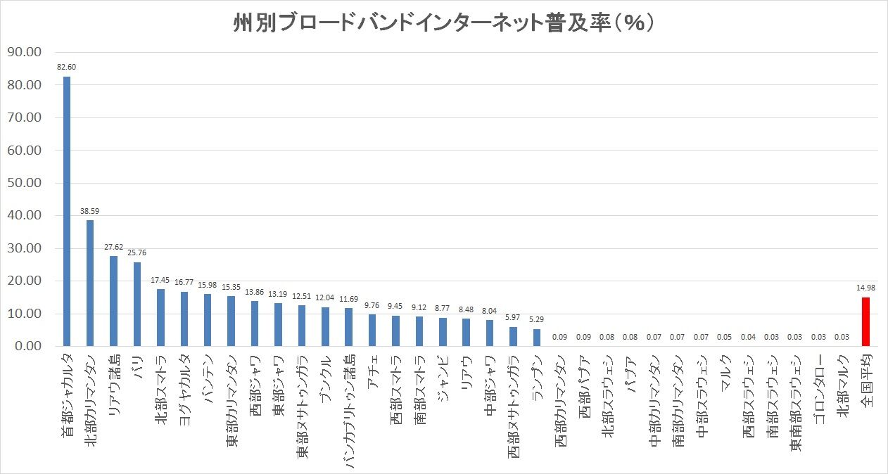 ブロードバンドのインターネットとはISDN以上の高速・大容量の通信回線のことを言うようですが、2020年時点の州別ブロードバンド普及率はインドネシア全土で15%です。