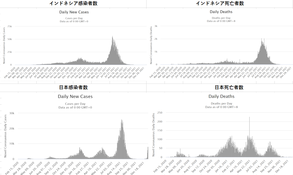 オミクロンの感染拡大で世界中がパニックになっていますが、インドネシアと日本の一日当たりの感染者数と死亡者数の推移を見る限り、両国においてはコロナ禍は既に収束し始めているのではないでしょうか。